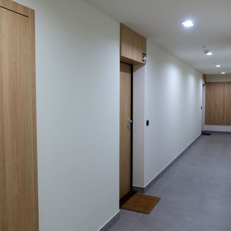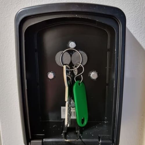 Die Wohnung befindet sich auf der linken Seite (die Nummer sowie weitere Daten erhältst du per PN). Dort hängt Safe mit Schlüssel, worin sich der Schlüssel und ggf. der Transponder für die Tiefgarage befindet.