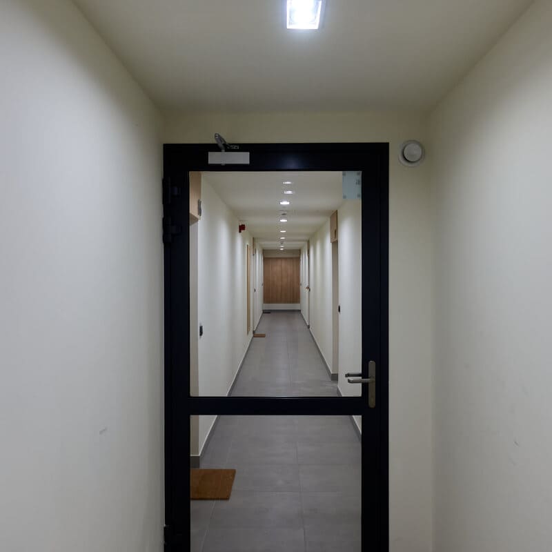 Im Treppenhaus geht es per Aufzug oder Treppe zum ersten Stockwerk. Im ersten Stock angekommen musst du zwei mal rechts abbiegen, wo du durch eine Tür in einen langen Flur gelangst.