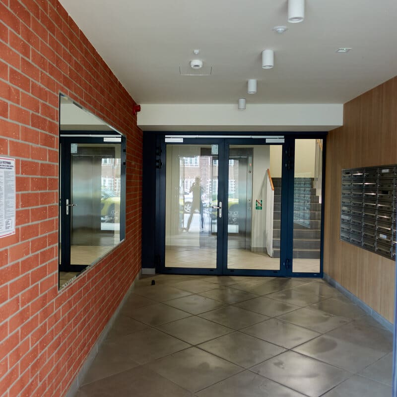 Das Apartment liegt nördlich von der Altstadt Danzig in der ul. Wałowa 40B. Der Haupteingang befindet sich rechts neben der Tiefgarageneinfahrt.