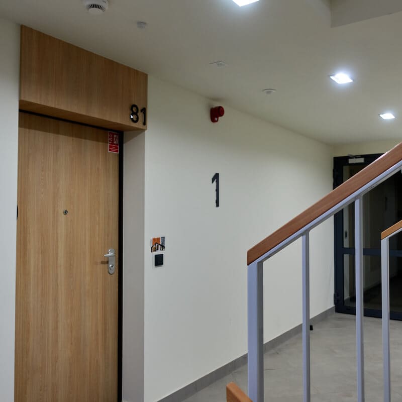 Um das Treppenhaus zu gelangen, muss ein Zahlencode an der Gegensprechanlage eingeben werden. Drücke zuerst die 0, geben dann den vierstelligen PIN-Code ein und drücken schließlich die Taste mit dem Klingelsymbol. Anschließend ertönt ein Signal und die Tür ist entriegelt.